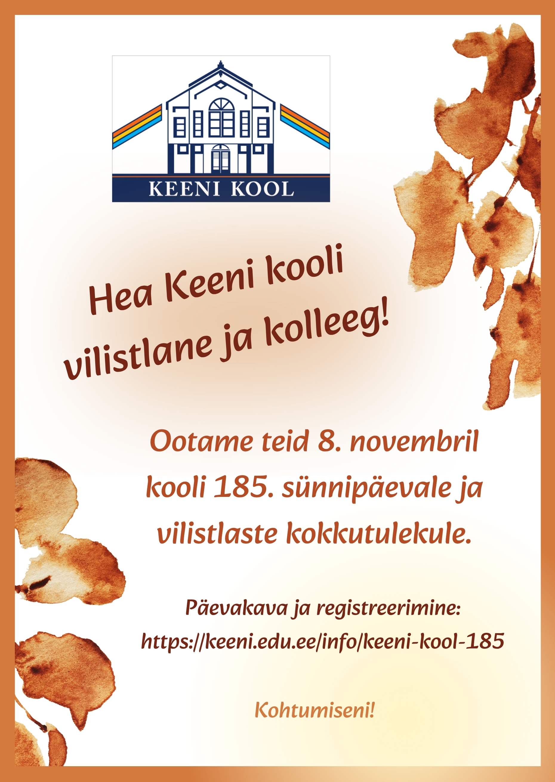 Laupäeval, 8. novembril tähistame Keeni kooli 185. sünnipäeva ja toimub vilistlaste kokkutulek. Osalemisest teata registreerimisvormi kaudu: https://forms.cloud.microsoft/e/jhXaM6w8TS